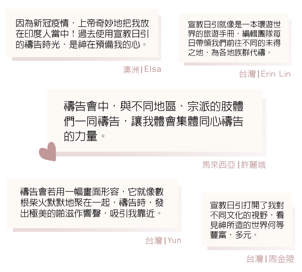 我們在各地皆有同工負責推廣《宣教日引》,除了美國及馬來西亞,我們的發行夥伴還包括臺灣的聯合差傳事工促進會、香港基督徒短期宣教訓練中心、加拿大華福及新加坡福音自傳會,若你有意推動宣教禱告歡迎接洽。