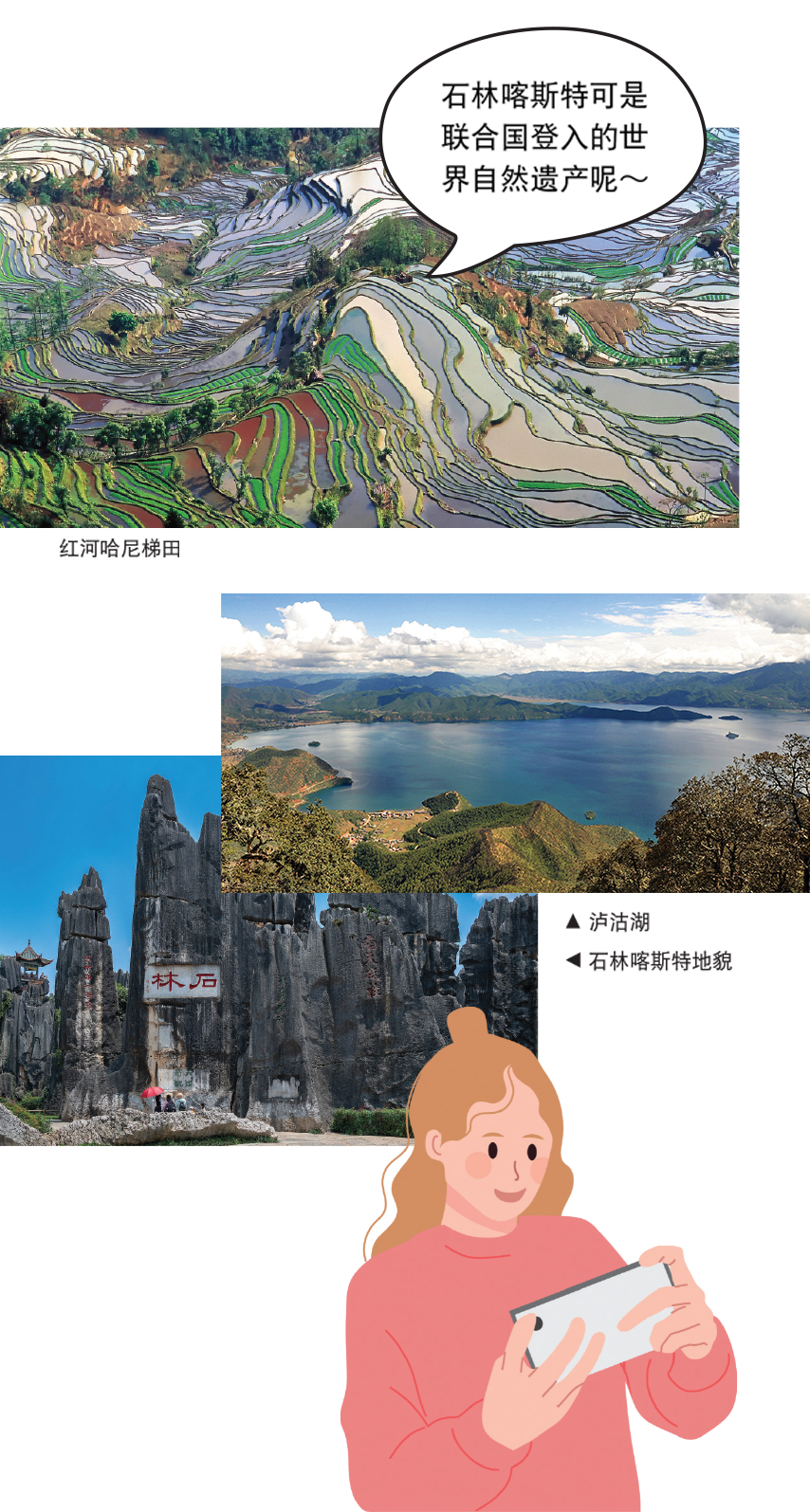 云南还拥有红河哈尼梯田、石林喀斯特地貌、泸沽湖、洱海、滇池等高原湖泊等世界级地貌!